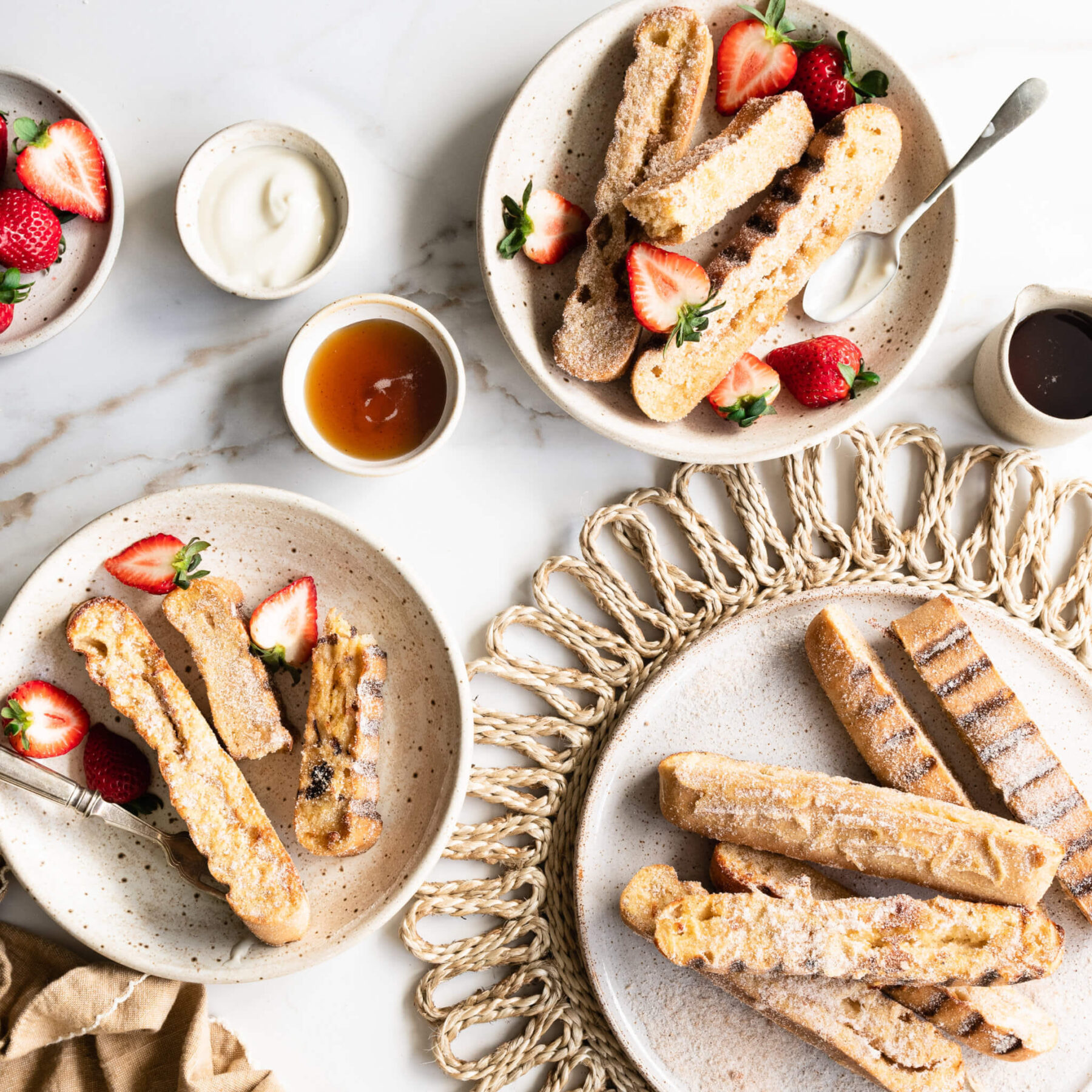 Once the panini sticks have absorbed most of the egg mixture, place in the air fryer or cook in batches on the pan, turning often until lightly cooked through and crisp and golden on the outside.
